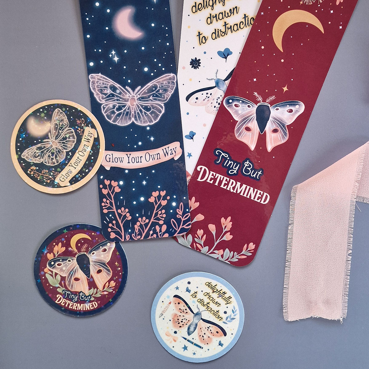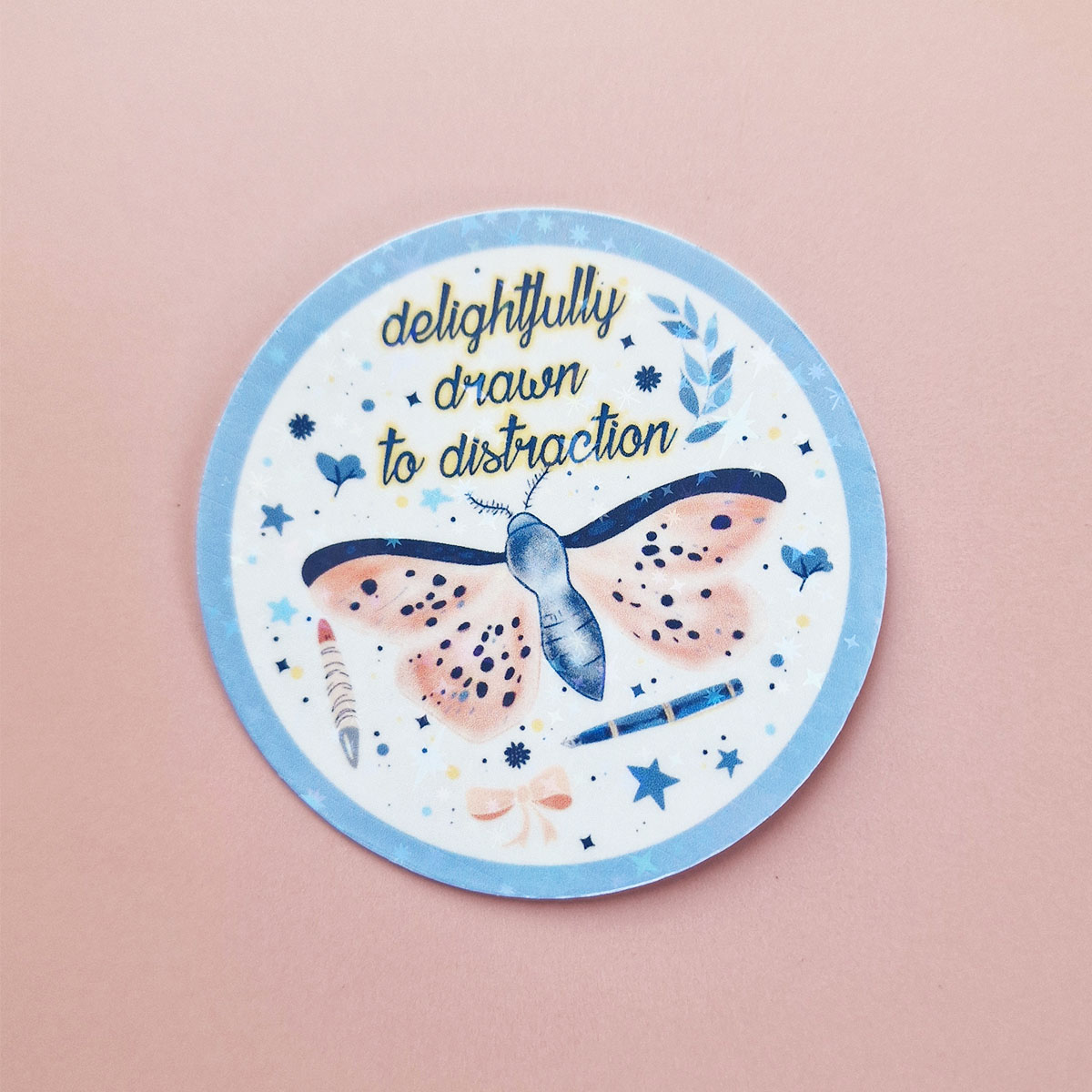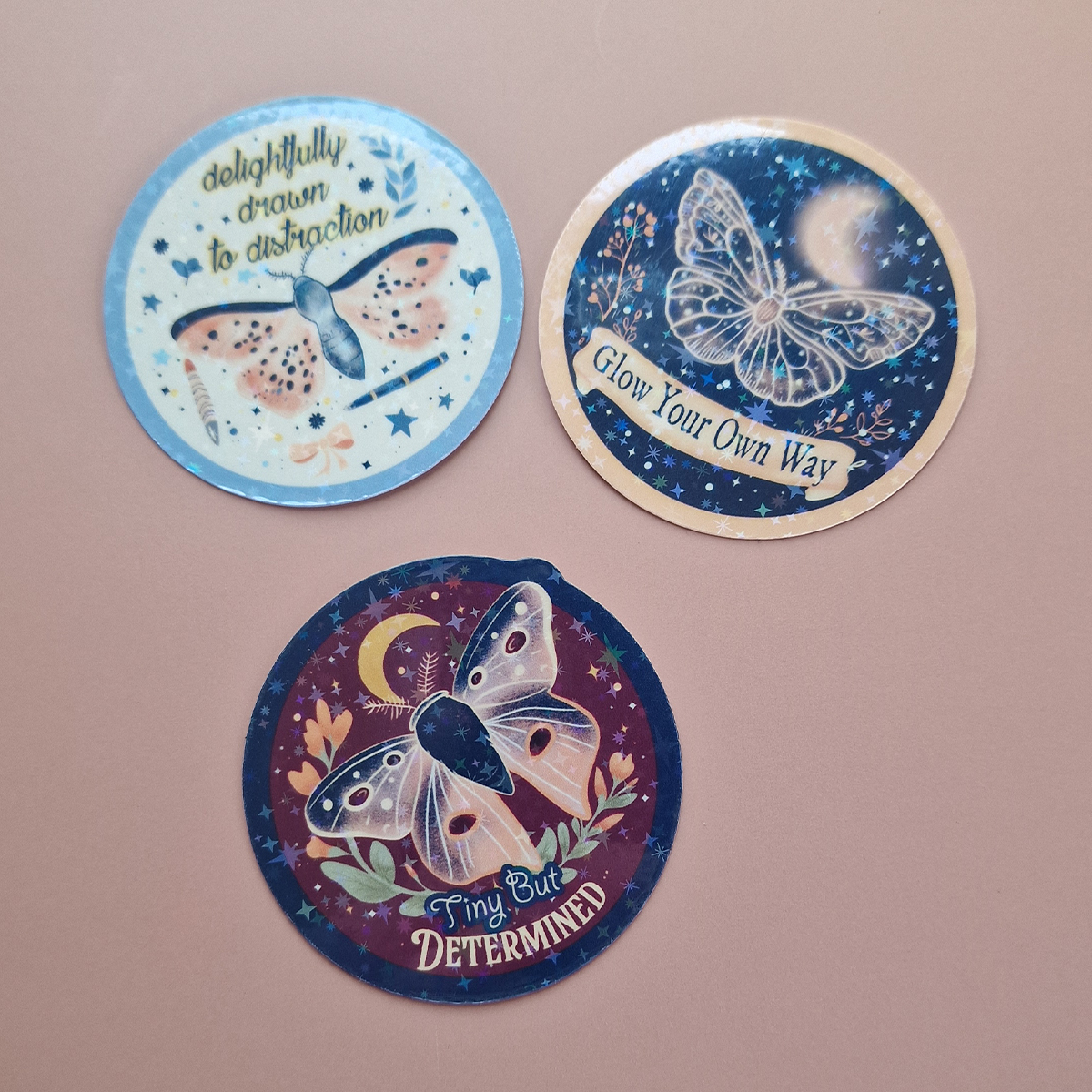 Whimsical, a little chaotic, and totally charming — just like your best ideas. This sticker features fluttery moths on a crisp backdrop, plus a swirl of holographic stars for extra sparkle.