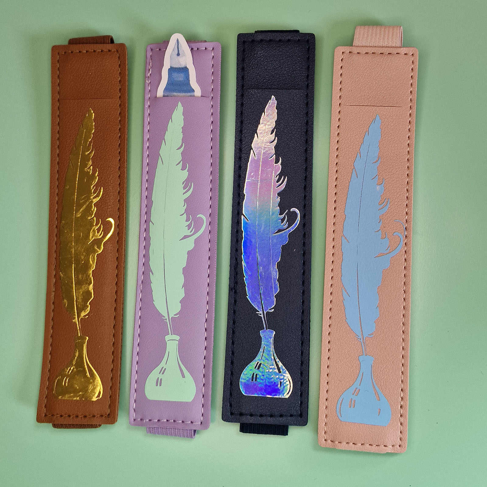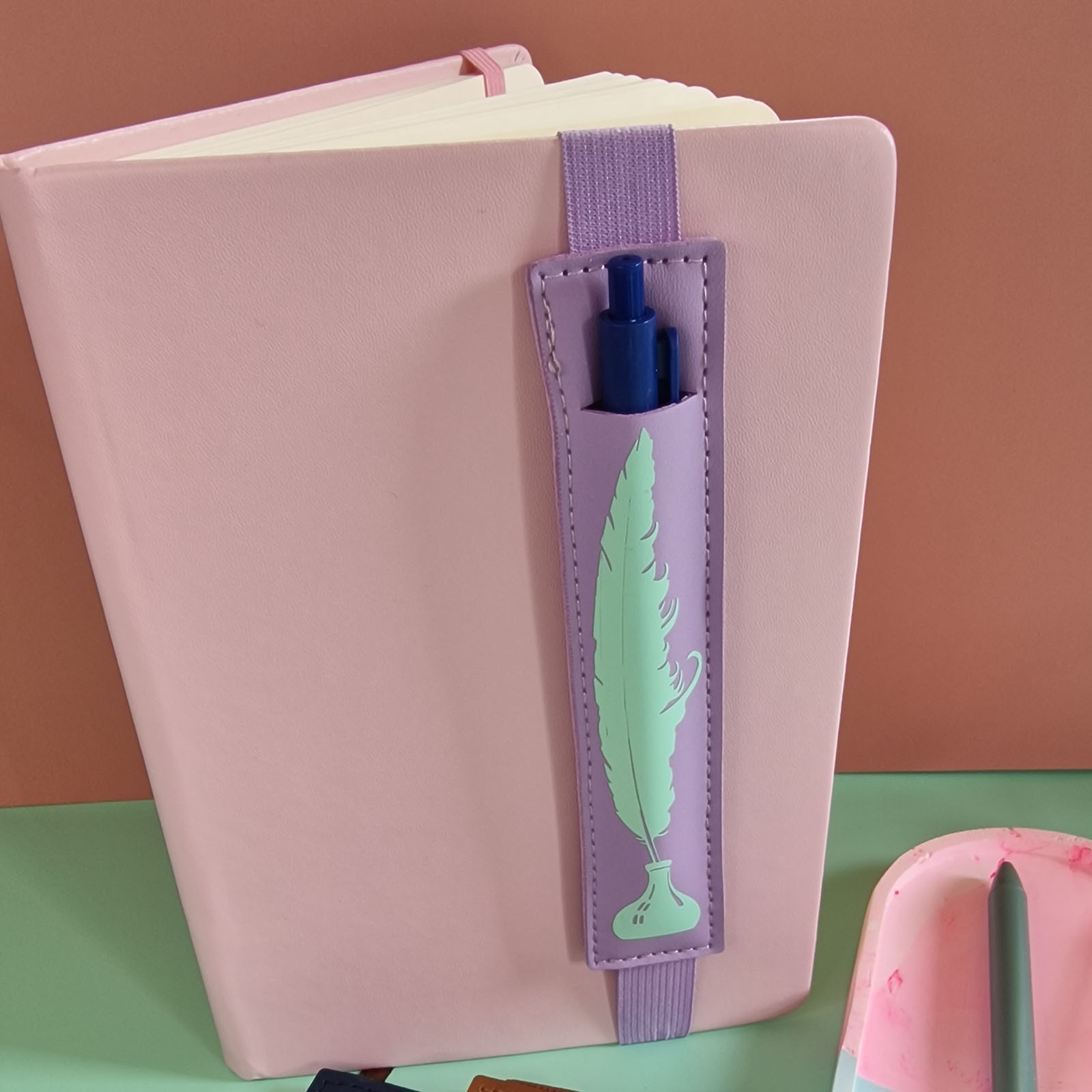Made from high-quality faux leather and available in a variety of dreamy colours, each holder clips effortlessly onto your notebook or journal cover using a secure elastic loop. The front pouch holds most standard pens or pencils snugly—so you’re never left scrambling for a pen mid-idea again.