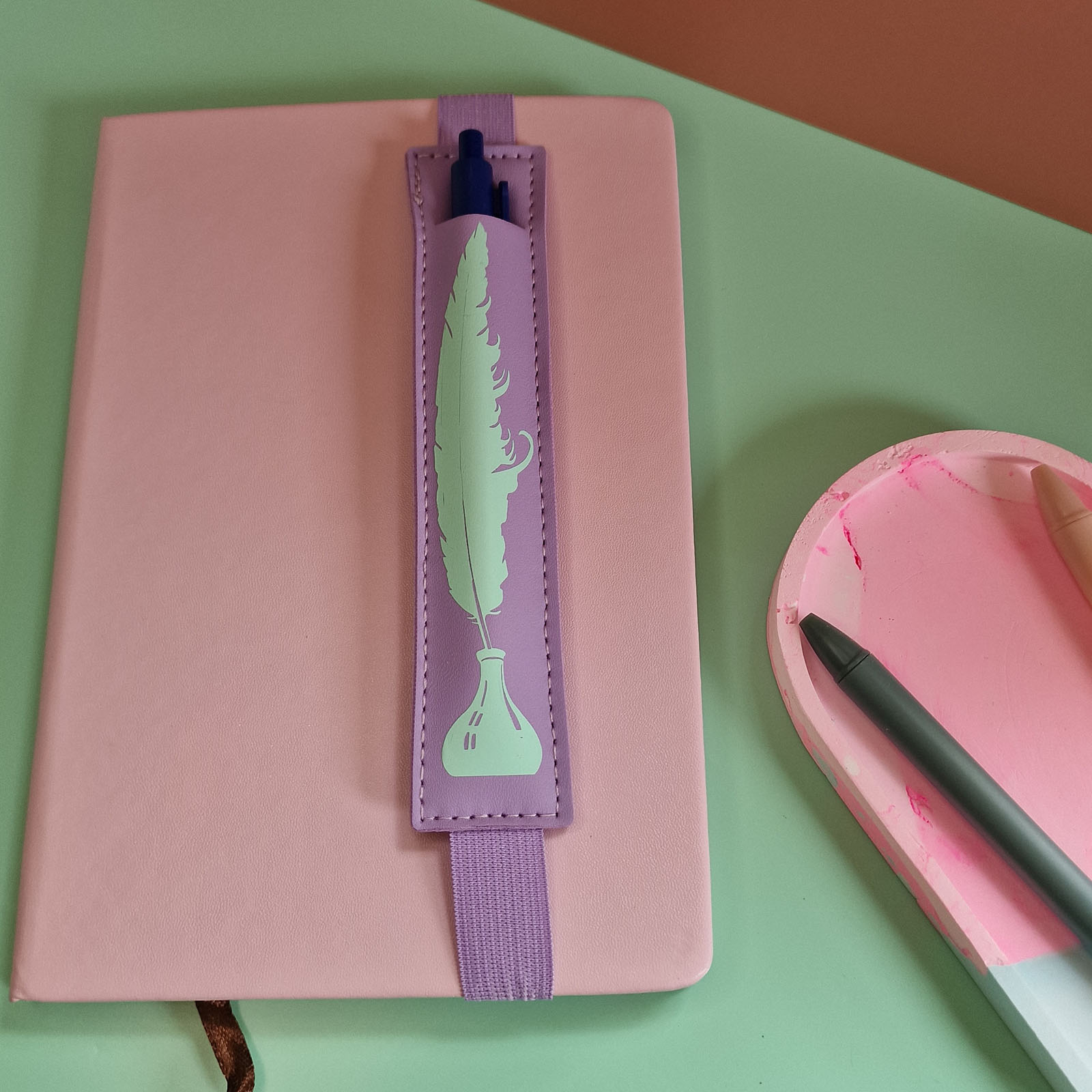 Keep your pen stylishly at the ready with this beautifully crafted lilac notebook pen holder featuring a mint quill and inkpot design. Whether you’re writing poetry, planning your week, or pretending you’re drafting a letter from a candlelit desk, this accessory blends classic charm with practical flair.